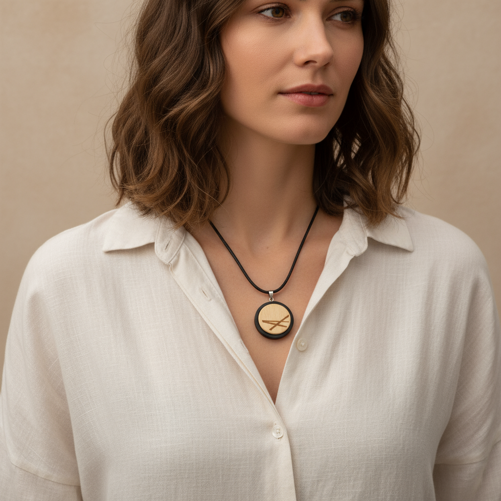 Trage die Kraft der Alpen bei dir! Diese handgefertigte Holzkette vereint die natürliche Schönheit von österreichischem Zirbenholz mit einem modernen, gravierten Motiv in schwarzer Holzeinfassung.