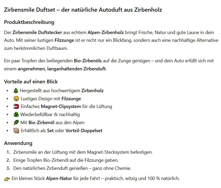 Hol dir mit dem Zirbensmile nicht nur einen Duftstecker, sondern ein Stück Alpen-Natur und Lebensfreude für unterwegs. Ob Kurzstrecke oder Roadtrip – dein Auto riecht frisch, natürlich und unverwechselbar.