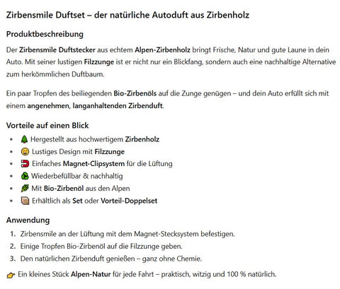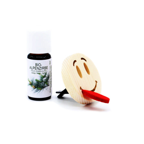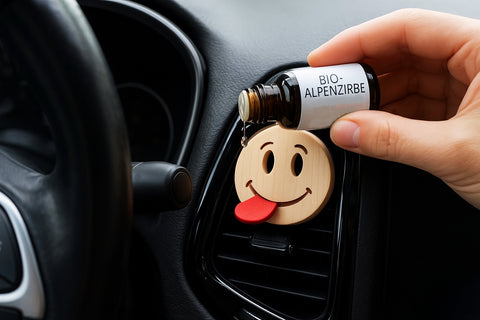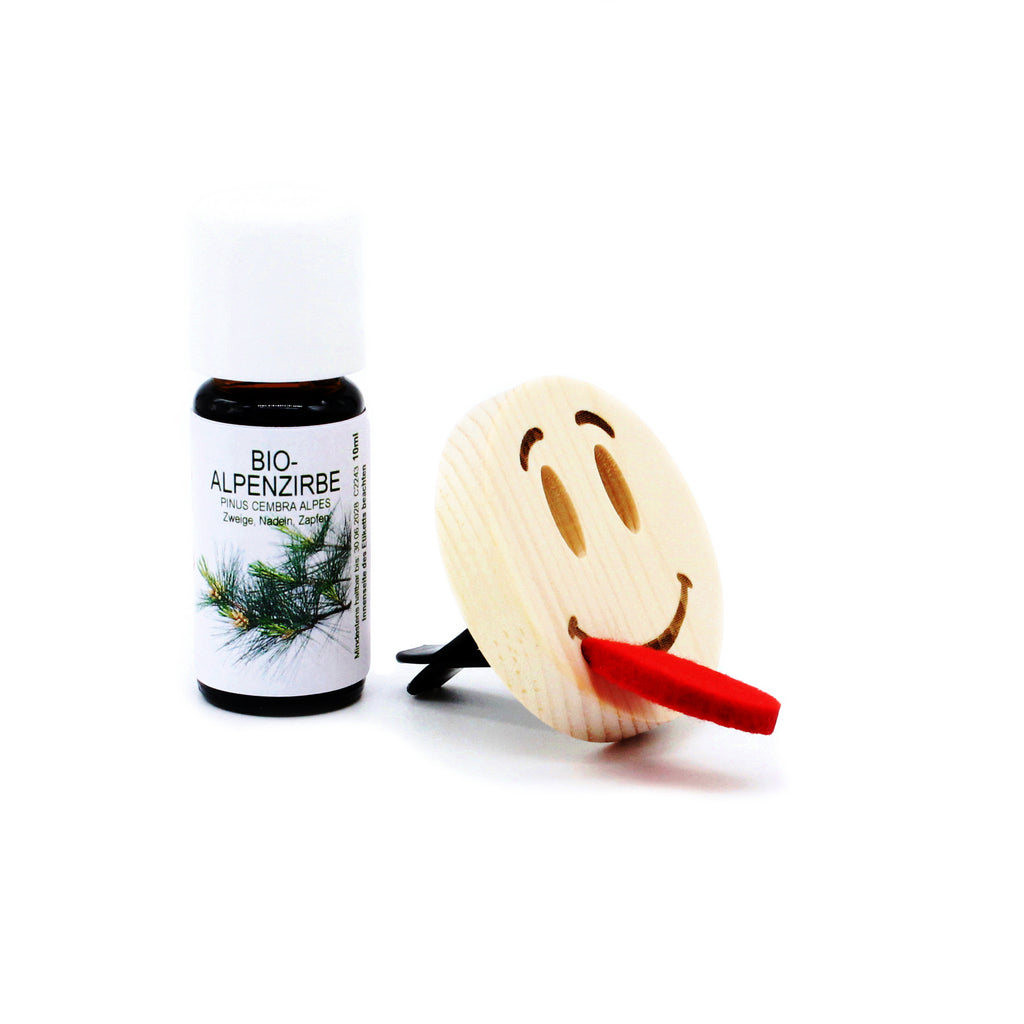 Zum Duftstecker gehört unser feines Bio-Zirbenöl. Einfach ein paar Tropfen auf die Filzzunge geben – und schon verströmt der Zirbensmile ein intensives, langanhaltendes Aroma. So wird jede Fahrt zum entspannenden Erlebnis.