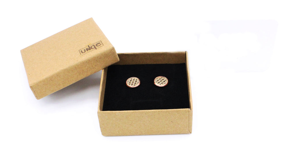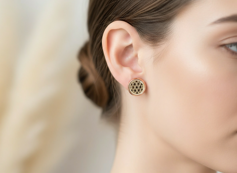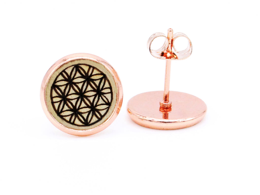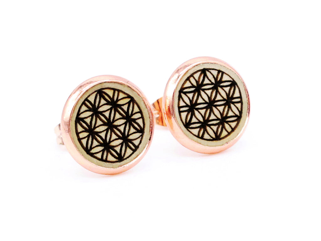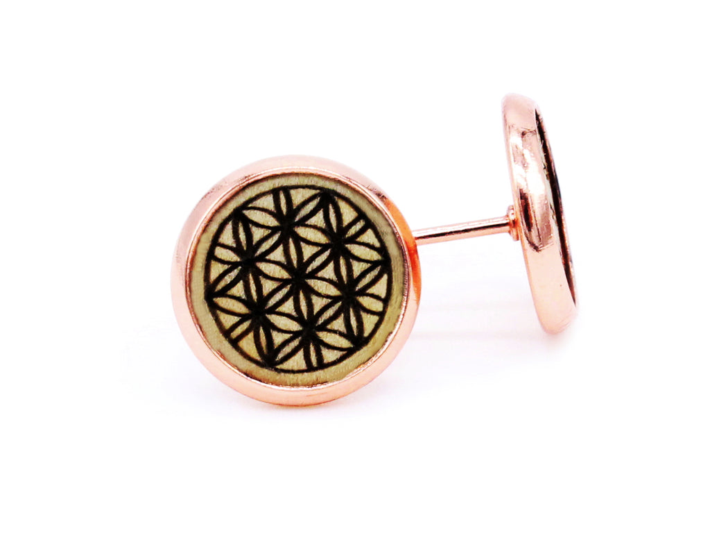 Entdecken Sie die besondere Schönheit unserer handgefertigten Ohrstecker aus edlem Zirbenholz. Das filigrane Lebensblume-Motiv wird präzise per Laser in das naturbelassene Holz eingearbeitet und harmoniert perfekt mit der rose-goldenen Einfassung.